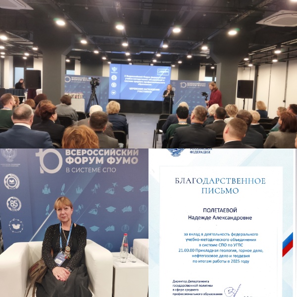 11-13 ноября 2025 года состоялся X Всероссийский Форум федеральных учебно-методических объединений в системе СПО "Традиции и инновации: 85 лет СПО и 10 лет ФУМО". Костромской политехнический колледж представляла Полетаева Н.А. - методист колледжа, председатель УМК по прикладной геологии ФУМО 21.00.00. Мероприятие проходило на базе технопарка в г. Нижний Новгород. На пленарных заседаниях обсуждались вопросы " Стратегические приоритеты развития СПО и новые вызовы для ФУМО" и "Кадровый потенциал нацпроектов начинается с СПО". В рамках форума была организована работа трёх треков: методического, экспертного и отраслевого. Полетаева Н.А. приняла участие в работе методического трека, на котором обсуждались такие вопросы, как "Профессионалитет: от проекта к закону", "Модель реализации НОТ "Профессионалитет", основанной на интегративном подходе", "Профессиональное образование - профессиональные учебники". 12 ноября в течение всего дня проводилась конференция "Актуальные вопросы общего образования в СПО". Форум завершился церемонией награждения участников.
